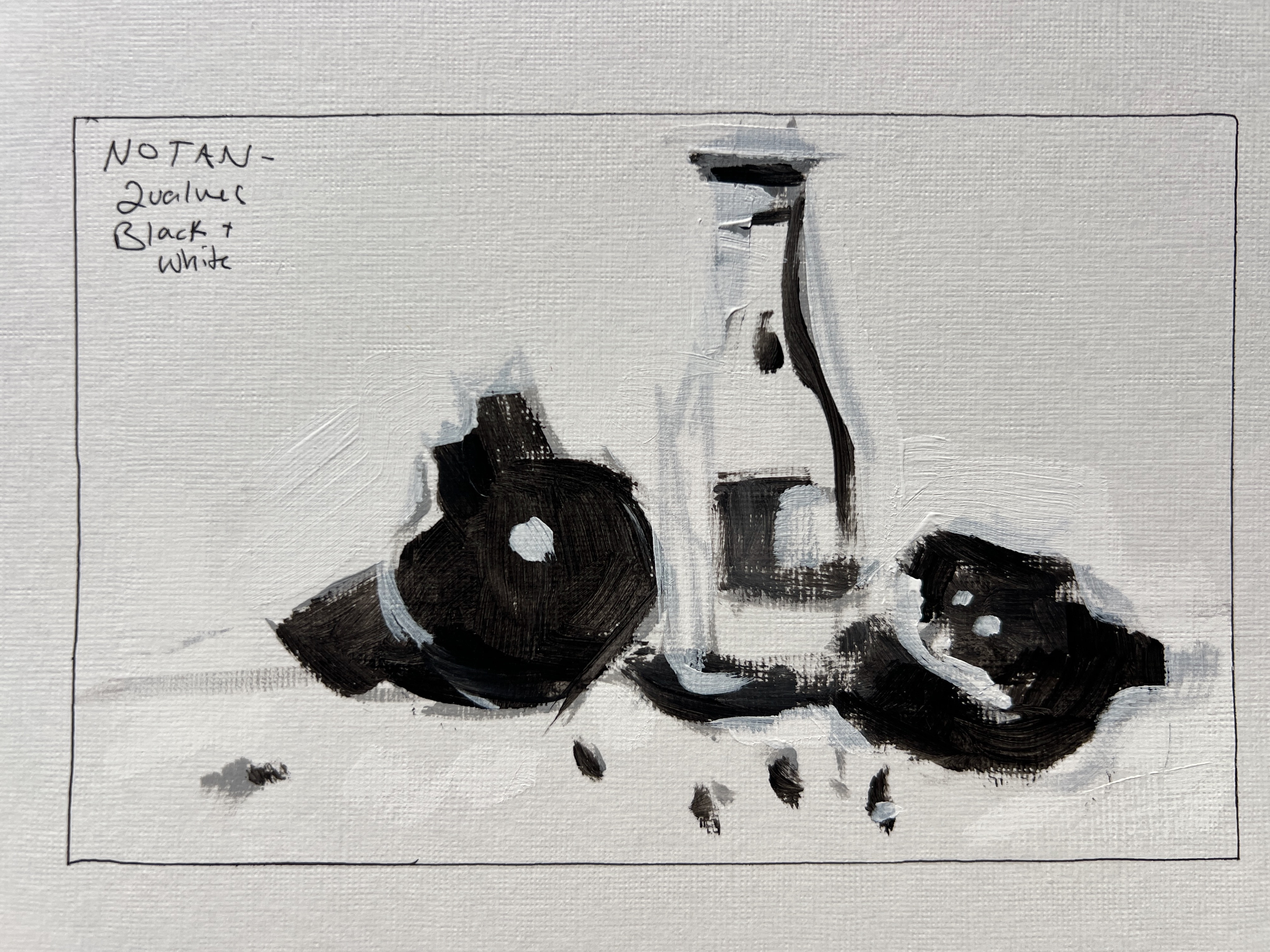 I always start with a Notan, using only black and white to divide the scene into light and dark. Don’t expect these to look “good” — the point is to see structure. In this still life, for example, the pomegranate is dark even in light, which tells me how it will behave tonally.