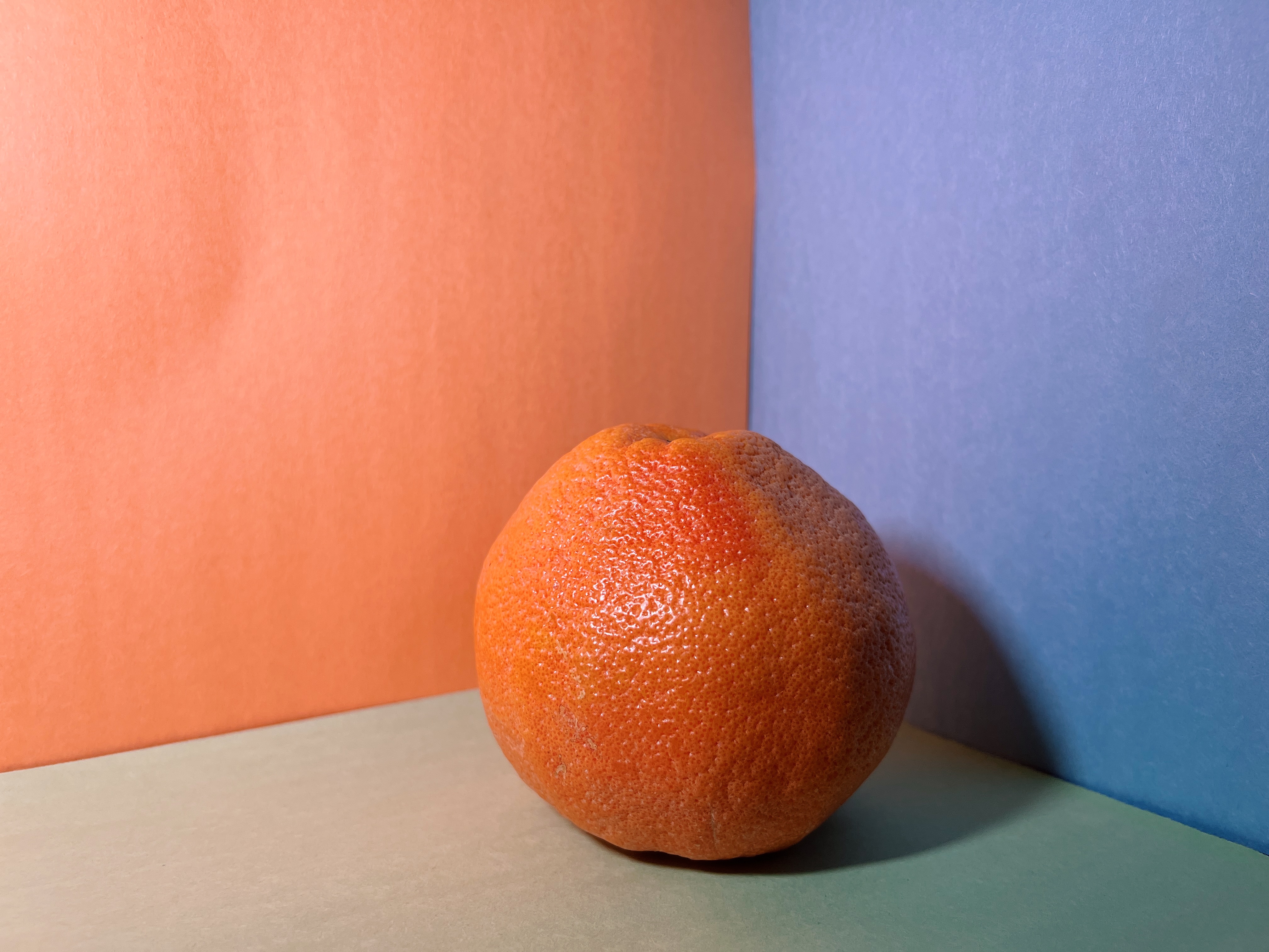 In this project, Stern has us paint a grapefruit placed against a wall that closely matches the color of its flesh. The goal is to eliminate clear boundaries in certain areas so that the form emerges purely through subtle shifts. A quick note on my setup: I went to the grocery store fully intending to find a grapefruit with yellow flesh. No luck—everything leaned pinkish-orange. So I adjusted and chose an orange background instead.